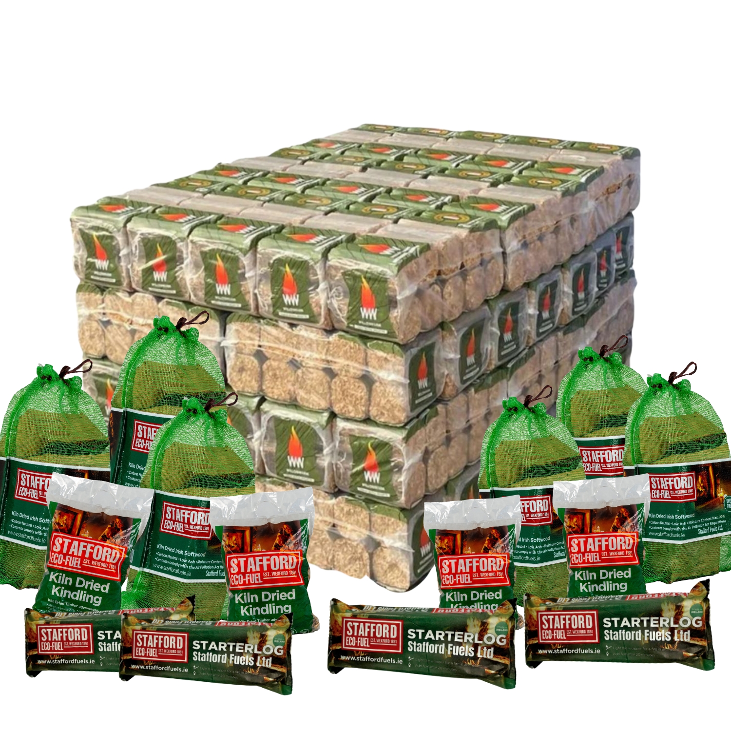 Bundle contains: 25 x WillowWarm Briquettes + 5 x Stafford Starter Logs + 5 x Stafford Klin Dried Kindling + 25 x Stafford Kiln Dried Softwood
